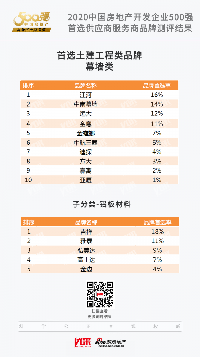 《2020中國房地產開發企業500強測評報告》和《2020中國房地產開發企業500強首選供應商服務商品牌測評報告》同時揭曉。測評報告顯示,武漢弘美達幕墻建材有限公司榮獲2020中國房地產開發企業500強首選供應商·鋁板材料類。
